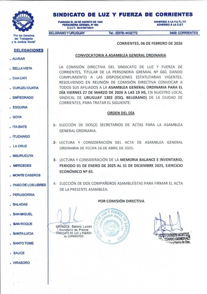 La Comisión Directiva del Sindicato de Luz y Fuerza de Corrientes informa a sus afiliados que se ha convocado a la Asamblea General Ordinaria correspondiente al Ejercicio Económico N° 65, en cumplimiento de las disposiciones estatutarias vigentes.